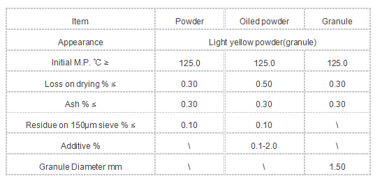 Properties: Light yellow powder(granule). Density is 1.51 g/cm3.Soluble in chloroform, partly soluble in CS2,acetone,insoluble in sherwood oil, benzene, alcohol and water.